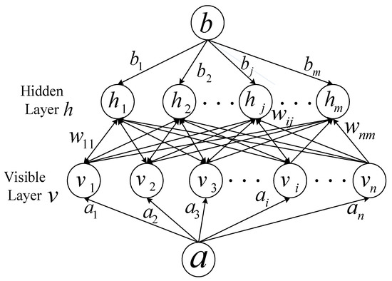 DBN is composed of several restricted Boltzmann machines (RBMs). The definition of the RBM model is based on the energy function. It is a basic component of DBNs and a key preprocessing unit in deep learning [17]. RMB is a basic single-layer machine learning network and has extensive applications. The formulas involved in the following text refer to the study of Chen and Li [17]. As shown in Figure 1, an RBM structure has two layers, namely, visible and hidden layers. A connection exists between each neuron node in the adjacent layer, and in each layer, the neuron nodes remain in a connectionless state with each other. The connection weight between two layers is W. RBM neurons are Booleans, implying that only two states exist, 0 and 1. State 1 indicates the activation of a neuron, and state 0 indicates suppression. In a way, for a given visible and hidden layer neuron in a binary state, the energy function of the RBM is as follows: