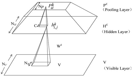 The CRBM model, as shown in Figure 2, comprises the view layer V, the hidden layer H, and the pooling layer P, for a total of three layers. We assume that the size of the input layer matrix is , the number of groups of matrices in the hidden layer is k, each group is a binary array with the size of , and hidden layer units are present. Each group of hidden layers is associated with an size filter.