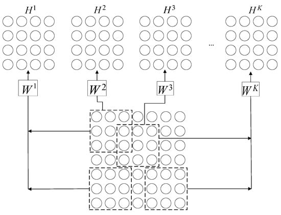 Figure 3 shows the process of obtaining the hidden layer from the visible layer. The size of the convolution kernel is , and the hidden layer units are divided into k sub-matrices. connects the visible and hidden layers. Each hidden layer unit represents a specific feature extracted from a neighborhood unit of a visible layer. Moreover, indicates the value of each hidden layer unit bias, and is the bias globally shared by all visible units. We obtain the energy number of CRBM as Equation (9):