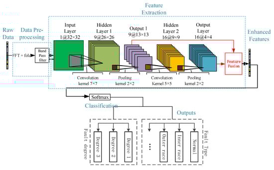 Figure 5 is the flowchart of the improved CDBN-based bearing fault diagnosis model proposed in this study. The input vibration signal is at a length of 1024. After FFT, it is normalized to between 0 and signals of different fault types and degrees of failure. Moreover, band-pass filtering is conducted to enhance texture features and reduce the noise effect. The CDBN model is a combination of two CRBM layers. For the first CRBM layer, the convolution kernel size is 7 × 7, the number of link weight matrices is 9, each size matches the size of the convolution kernel, the pooling kernel size is 2 × 2, and the maximum pooling method is used. The output of the first layer with a size of 13 × 13 is a feature map, and it is used as the input of the second CRBM layer. The second hidden layer adopts a size of 9 × 9 with 16 link weight matrices. The size of the second convolution kernel is 5 × 5, and the size of the second pooling kernel is 2 × 2. The proposed model also uses the maximum pooling method. At the end of the model, softmax is used for classification. The extracted features are mapped to 13 different types, divided according to fault types or degrees. Unlike the standard CDBN, before classification, the outputs of the first layer and second layer use feature fusion to further increase the diagnostic accuracy. Table 1 displays the specific parameters of the network.