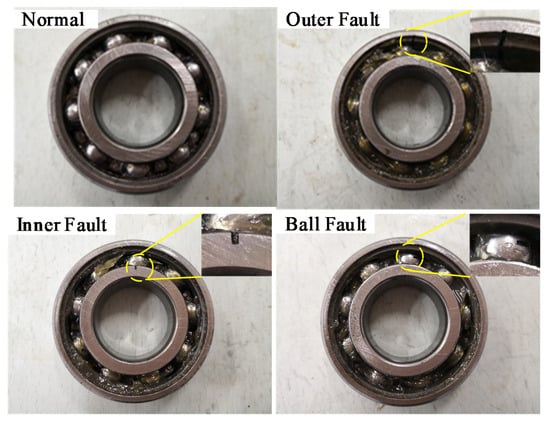 As shown in Figure 6, the test platform included variable frequency motors, normal bearings, test bearings, loading systems, and acceleration sensors. The test bearing model was 6205-2RS SKF, and specific bearing parameters are listed in Table 2. Single-point or compound faults were set on the bearing surface by wire cutting. Figure 7 shows the real pictures of four bearings with four different health conditions. Types of faults included outer-race faults, ball faults, inner-race faults, inner-race compound ball faults, outer-race compound ball faults, and inner-race compound outer-race faults (IO). In this table, IB indicates that inner-race fault and ball faults exist at the same time on the test bearing, both under a fault degree of 0.2 mm. In the same way, IO indicates that inner-race fault and outer-race fault exist at the same time, and OB indicates that outer-race fault and ball fault exist at the same time. Specific data sets are described in Table 3 and Table 4; dataset1 was collected under 0 kN load and dataset2 was collected under 1 kN load. The motor speed was set to 961 rpm, signal sampling frequency was set as 10 kHz, and the entire experiment was under a load of zero condition.