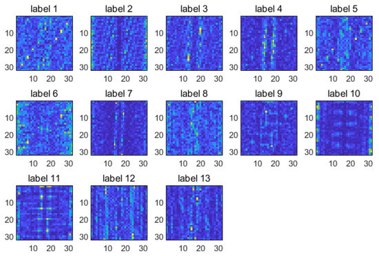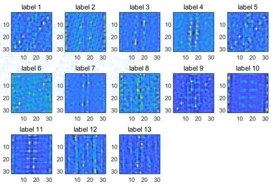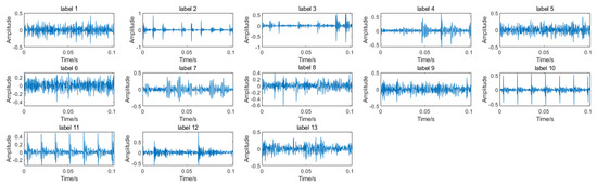 The raw data of the bearing vibration signals is shown in Figure 8. It can be observed that the signal is noisy and lacks key information. The first step of the data preprocessing is to fold it into the size of 32 × 32 by FFT. Figure 9 shows the state of 13 sample types after FFT processing and folding. The second step of data preprocessing is filtering and normalization, for the purpose of filtering out noise. Figure 10 shows the samples after band-pass filtering preprocessing. The figures clearly show that the noise was reduced without weakening the fault signal. By contrast, the texture features of the samples were enhanced, which is more conducive for convolutional neural networks to extract features.