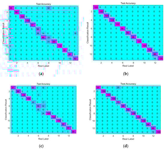 The test results of the standard CDBN are illustrated in Figure 11a,c. The figure shows that the improved CDBN was able to achieve higher accuracy than the standard CDBN, especially in outer-race faults and ball faults. However, for IO fault types, namely, label 12, the classification accuracies of both models had no obvious optimization because of the difficulty in catching distinguishable features. In general, the proposed improved CDBN model had better performance compared with the standard CDBN model.
