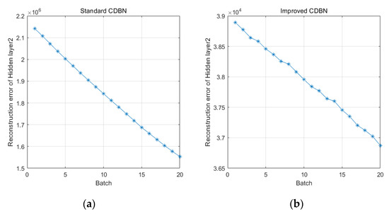 Comparison of second-layer reconstruction error when training (a) standard CDBN and (b) improved CDBN.