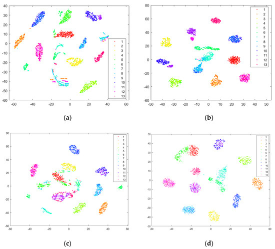 A commonly used method for high-dimensional data analysis is t-distribution stochastic neighbor embedding (tSNE). tSNE can reduce any dimension to less than three at will. As shown in Figure 13, an intuitive feature distribution was obtained by using tSNE to visualize the features of the standard and improved CDBN.