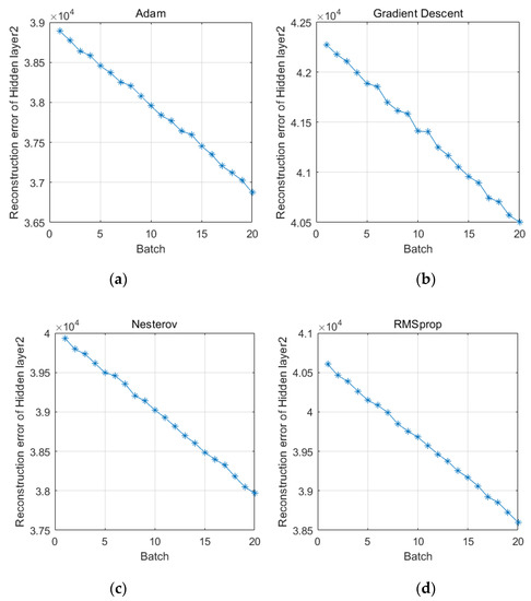 Reconstruction error is a key indicator for measuring model learning ability. Different optimizers were employed for comparative analysis, and the reconstruction errors by different optimizers are shown in Figure 14. As shown in the figure, during the training, the reconstruction error of the CDBN model with Adam optimizer dropped smoothly and had the smallest reconstruction error.