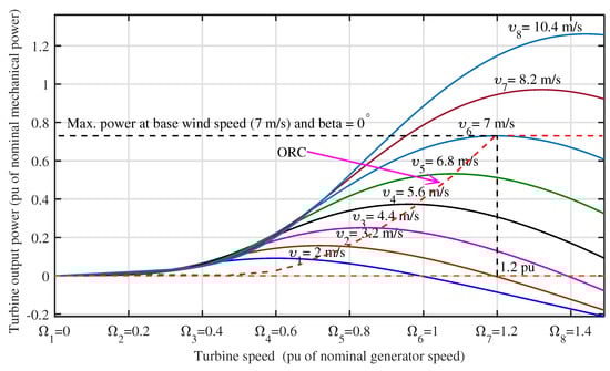 Figure 2 demonstrates the mechanical power output of the VSWT under different wind speeds. There exists a unique maximum power point, , at each wind speed. All these maximum power points constitute an optimal regime characteristic (ORC). The ORC indicates the operating region where the maximum possible energy can be extracted from the fluctuating wind. The primary goal of the MPPT control strategy is to continuously operate the VSWT on the ORC, despite fluctuations in the wind speed.