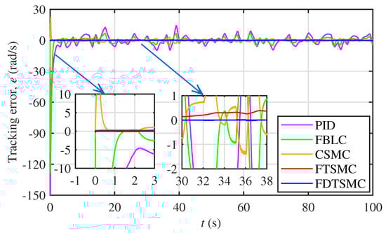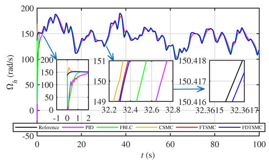 Figure 6 demonstrates the PMSG rotational speed tracking performance. It is evident from the zoomed-in segments of the figure that the FDTSMC is offering a superior tracking performance among its competitors. Moreover, both the FTSMC and FDTSMC offer a finite-time convergence. The superior performance of the FDTSMC to the FTSMC, CSMC, FBLC and PID, as well as the finite-time convergence of both the FTSMC and FDTSMC, are also evident from the speed tracking error of the PMSG, as depicted in Figure 7. The CSMC exhibits slightly better performance than both the FBLC and PID.