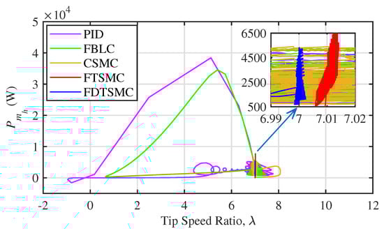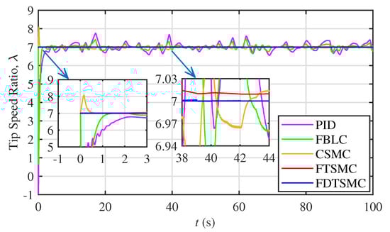 Figure 8 indicates the tip speed ratio performance of the VSWT. The PID has the worst performance, and it offers a lot of oscillations around the . However, both the FTSMC and FDTSMC are accurately tracking the with FDTSMC being the best MPPT candidate.