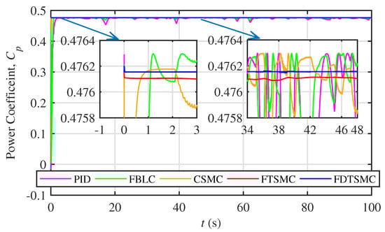 Figure 9 shows the power conversion coefficient of the VSWT. It is clear that both the FTSMC and FDTSMC strategies are tracking the optimal power conversion coefficient, , throughout the selected stochastic wind speed profile, thus guaranteeing the maximum wind power extraction. The zoomed-in segments of the figure clearly depict that, based on the tracking, the FDTSMC is the best MPPT candidate, while the PID is the worst.