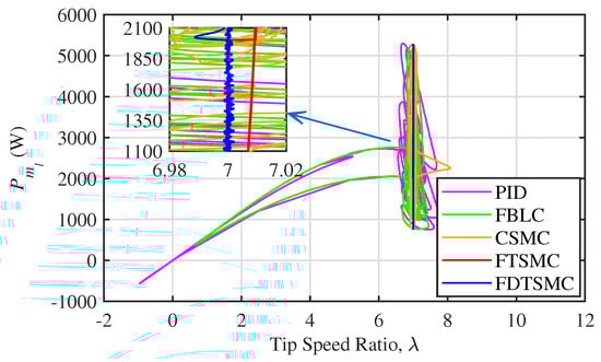 Figure 10 and Figure 11 indicate the low-speed shaft mechanical power and the high-speed shaft mechanical power versus the tip speed ratio, respectively. It is evident that both the FTSMC and the FDTSMC strategies maintain the low-speed as well as the high-speed shaft mechanical powers in the close neighborhood of the optimal tip speed ratio, . On the other hand, both the FBLC and PID techniques have very poor performance on account of having a lot of power fluctuations around the optimal tip speed ratio.