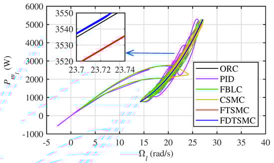 Figure 12 represents the low-speed shaft mechanical power versus the low-speed shaft rotational speed. The proposed MPPT controller efficiently maintains the rotational speed of the VSWT in such a manner that the system operates on the ORC (optimal regimes characteristic)—that is, the region where the maximum wind power can be extracted. However, both the FBLC and PID schemes experience a lot of speed as well as mechanical power fluctuations.
