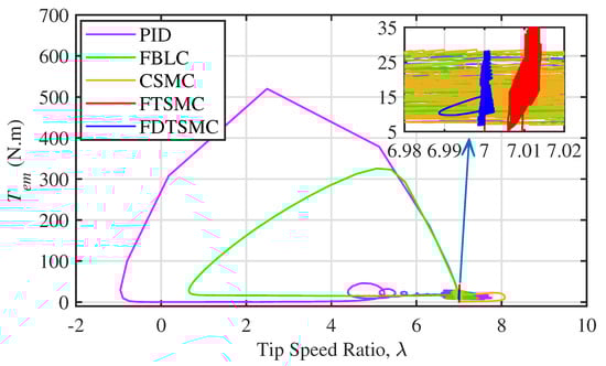 Figure 13 illustrates the PMSG electromagnetic torque versus the tip speed ratio. Since both the FTSMC- and the FDTSMC-based MPPT candidates maintain the torque at the optimal tip speed ratio, , it implies that both are capable of extracting the maximum wind power. The FDTSMC has the best, while the PID has the worst performance because of frequent torque fluctuations. Similarly, Figure 14 shows the VSWT mechanical torque versus the low-speed shaft rotational speed. Again, both the FTSMC- and the FDTSMC-based MPPT candidates maintain the torque around the ORC. It signifies that these two MPPT strategies are capable of extracting the maximum wind power, with FDTSMC being superior to the remaining MPPT candidates.