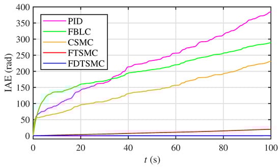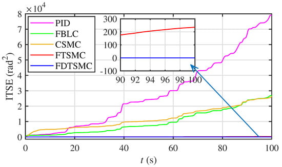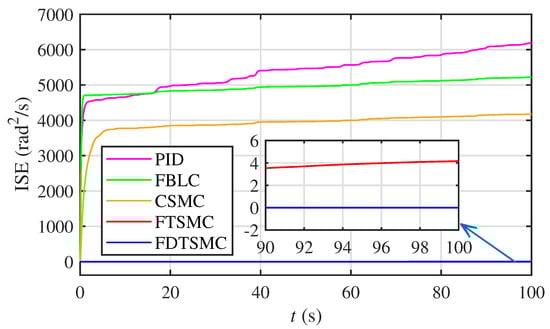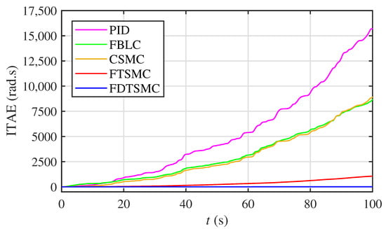 The performances indices, ISE (integral squared error), ITSE (integral of time squared error), IAE (integral absolute error) and ITAE (integral of time absolute error) have been computed for PMSG–WECS using for each MPPT strategy. It is evident from Figure 15, Figure 16, Figure 17 and Figure 18 that as the time advances, the accumulative error of each MPPT controller also increases. However, the proposed FDTSMC renders the flattest profile and the smallest error in each case, thus guaranteeing its superior performance. Moreover, the FTSMC is the second best MPPT candidate, while the PID is the worst.