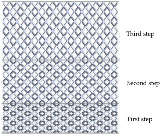As for the classification of lattice structures, according to the arrangement of unit cells in lattice structures, lattice structures are generally divided into random lattice structures and periodic lattice structures [2,4,7,10]. With the design and optimization of topology structures, Wang and Rosen proposed the conformal lattice structures originally [75]. Compared with periodic lattice structures, conformal lattice structures can strengthen or consolidate complex surfaces. Dong et al. [23] described the classification of lattice structures in detail. They divided lattice structures into three categories, the first category is random lattice structures or disordered lattice structures (as shown in Figure 2a). The unit cells of random lattice structures are randomly distributed in the design space, and have different topological structures and sizes. The second category is periodic lattice structures. This kind of lattice structures can be regarded as the structure formed by periodic repeated arrangement of lattice cells with certain shape, topology, and size in three-dimensional Euclidean space (as shown in Figure 2b). The third kind is pseudo periodic lattice structures (also called conformal lattice structures). In pseudo lattice structures (i.e., conformal lattice structures proposed by Wang and Rosen), each unit cell only has the same topology, but its size is different (as shown in Figure 2c). Although lattice structures are divided into random, periodic, and pseudo, they can represent the unit cells arrangement in space, it is difficult to represent the unit cells arrangement form for gradient lattice structure. For example, the step-wise gradient lattice structure includes three floors (as shown in Figure 3) [76], each step of lattice structure has the same cell topology and regular arrangement, but the cell topology and arrangement between steps are different. In this way, it is difficult to classify the lattice structure as periodic or aperiodic cellular structure. In addition, with the research of positive Poisson’s ratio (PPR) and negative Poisson’s ratio (NPR) materials, many scholars have begun to study lattice structures with different Poisson’s ratio, which is usually named as non-uniform lattice structures [77,78,79,80,81]. In short, lattice structures with gradient and non-uniform PR unit cells should be referred to as non-uniform structures.