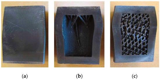 (1) High stiffness and strength [25,72,82,83,84,85,86,87,88]. Bauer et al. [82] fabricated and characterized micro-truss and -shell structures made form cellular ceramic composites. They observed a size dependent strengthening of the alumina shell, especially when the characteristic thickness was less than 100 nm. The compressive strength of the artificial porous material was 280 MPa and the density was less than 1000 kg/m3. Mahshid et al. [88] fabricated structure samples including solid, hollow, and lattice structure, and compared the strength of structures by compression test. The deformation of samples after compression test is shown in Figure 4. The result indicated that though the strength of lattice structure was lower than that of solid structure, it can still meet the application requirements, and reduced the use of materials, and achieve lightweight design.