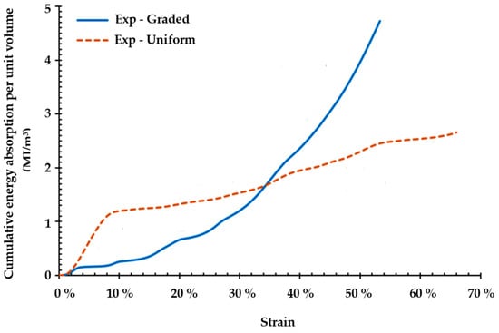 Cumulative energy absorption per unit volume vs. compressive strain curves of uniform and graded structures [90].