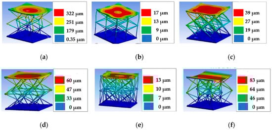 FEA simulations to estimate displacement of six lattice structures [92]: (a) model 1; (b) model 2; (c) model 3; (d) model 4; (e) model 5; (f) model 6.