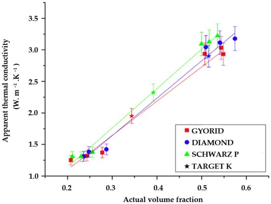 (4) Dissipate heat [27,44,45,46,78,97,98,99,100]. Wadley and Queheillalt [45] compared copper textile-based lattice structures with selected heat dissipation media including stochastic open-cell metal foams, periodic Kagome and lattice frame materials, corrugated ducts and louvered fins. Wadley and Queheillalt [45] pointed out that although the copper textile-based lattice structures performed as well as the stochastic open-cell metal foams (aluminum and copper based), the pumping power required was significantly lower for the textile-based structures, because of the periodic topology. Therefore, their overall thermal efficiency was about three times greater than that of comparable weight open-cell copper foams. In addition. Catchpole-Smith et al. also investigated the thermal conductivity of lattice structures [98]. Results showed that thermal conductivity was primarily a function of the material properties and volume fraction of the sample. The Schwarz primitive unit cell consistently gave the highest conductivity, with diamond and gyroid unit cells being marginally lower (as shown in Figure 8). On heat exchange and heat transfer properties of lattice structures, Fink et al. [99] and Do et al. [100] studied fluid dynamics of flow through microscale lattice structures, and verified the heat exchange and heat transfer performance of lattice structure.