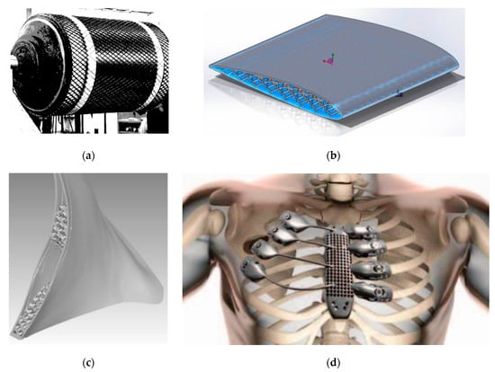 Applications of lattice structures: (a) winding of helical rib [63]; (b) aerial vehicle wing structure [56]; (c) fan blade [57]; (d) biomedical implant [7,121].