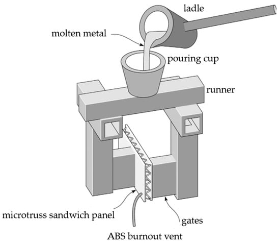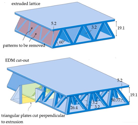 There are advantages and disadvantages in the fabrication of lattice structure by traditional processing methods. In terms of advantages, the lattice structures with large-scale structure can be fabricated by traditional processing method. Adversely, using traditional processing methods to fabricate the lattice structures will be time-consuming and cumbersome post processing and cause more energy consumption and produce waste material. For instance, the investment casting method proposed by Deshpande [21,24] has high requirements for the fluidity of melt-liquid metal, resulting in being limited to nonferrous casting alloys with high fluidity. Additionally, the process of investment casting is very complex and easy to produce defects. Figure 10 is principle of 3D lattice structure of metal prepared by investment casting. The cell size of octahedral lattice materials fabricated by this process can only reach millimeter scale, which is difficult to meet the requirements of micro-nano-scale lattice structure. In addition, the extrusion and electro-discharge machining method (as shown in Figure 11) proposed by Queheillalt [122] still needs special mold, and the fabricating process is particularly complex and increases the generation cost. It is difficult to fabricate lattice structures with thin ribs and panels. Besides, stretching net folding method and punched hole mesh drawing method are proposed by Kooistra [123,124]. The biggest advantage of stretching net folding is that the plate mesh is made of the original sheet metal, which wastes less raw materials in the production process and saves the raw materials greatly. However, it still needs severe deformation in the manufacturing process and can only be used for materials with high ductility, resulting in low structural strength and complex processing technology [125,126]. Additionally, stamping forming method caused most of the material wastes. The splicing technology proposed by Wadley [126] still has the defects such as unstable lattice structures and limited performance.