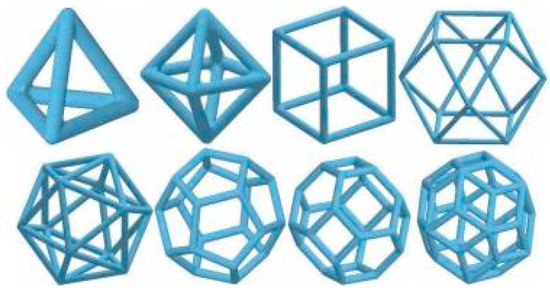 3D unit cell structure library [157]: tetrahedron, octahedron, cube, vector (top row, from left to right); icosahedron, dodecahedron, tetrakaidecahedron, triacontahedron (bottom row, from left to right).