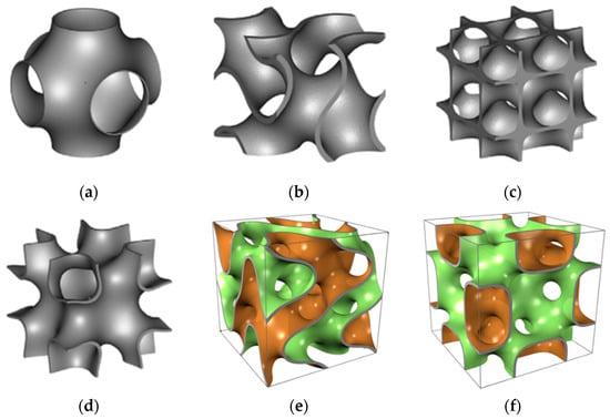 Unit cell based on TPMS: (a) Schwartz P [176]; (b) Schoen G [176]; (c) Schwarz D [176]; (d) Schoen IWP [176]; (e) Fischer - Koch S [172]; (f) Schoen FRD [172].