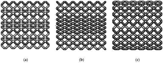In order to classify more clearly the types of cellular structures, Dhruv Bhate [6], Tao and Leu [7] classified cellular structures into three categories, i.e., foams (open-cell and closed-cell foams), honeycombs, and lattice structures. The shape of unit cells in the foam structures are randomly generated (as shown in Figure 1a), and the cell walls have random orientations in space [2]. In the book of Metal Foams: A Design Guide, Ashby, Evans and Fleck, et al. had introduced in detail the properties, applications, and manufacturing methods of metallic foam structures [8]. Davies and Zhen indicated clearly that metallic foam structures had high porosity ranging from 40% to 98% [9]. Foams are the common cellular structures. Like cork, cancellous bone and wood show various foams. Honeycomb structures have regular shape, and unit cells have the same shape and size (Figure 1b) [2,10]. There are many cell shapes in honeycombs such as tetrahedron, triangular prism, square prism, hexagonal prism, and so on [2,11]. At present, re-entrant honeycomb auxetic structures [12,13,14,15,16] and chiral honeycomb structures [17,18,19] are attractive, which improve the performance and extend the application of honeycombs. Lattice structures are the kind of architecture that are formed by the array of spatial unit cells with edges and faces (as shown in Figure 1c) [7,20]. Cellular shape and size can be uniform or non-uniform. In some academic studies, cellular structures are often equivalent to lattice structures because of neglecting the differences between lattices and foams and honeycombs [21,22]. In their research literatures, the foam structures are actually the lattice structures. In fact, compared with foams and honeycombs, lattice structures have better mechanical properties [3,23]. Queheillalt, et al. [24,25] and Clough et al. [26] demonstrated that lattice structures have the potential to improve compressive and shear strength over foams and honeycomb structures when designed to suppress buckling. Otherwise, lattice structures have many superior properties that foams and honeycombs do not get because of the unique property of tailoring. In other words, each unit cell, and even each strut in the lattice structure can be set as the design variable and be optimized to satisfy specific customized requirements functionally, which means mechanical properties of lattices are more flexible to be controlled than foams and honeycombs [23,27]. Therefore, it can be concluded that lattice structures have better performance than foam structures and honeycomb structures.