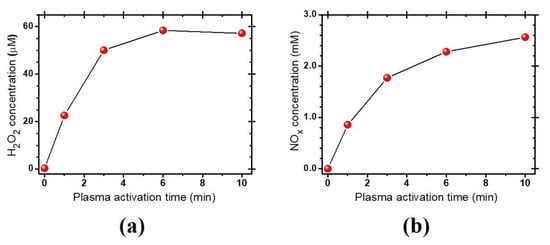 (a) and (b) concentrations of the plasma-activated water (PAW) as a function of plasma activation time. The PAW was prepared by activating de-ionized (DI) water with the soft plasma jet.
