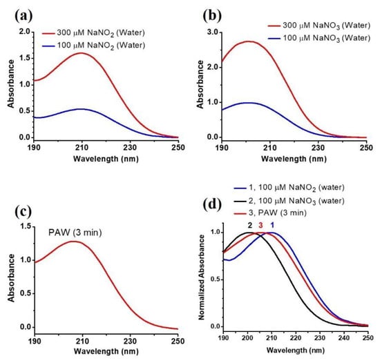 Optical absorption spectra of (a) nitrite, (b) nitrate, and (c) PAW in the wavelength region of 190–250 nm. (d) Normalized absorption spectra of nitrite, nitrate, and PAW. In (c,d), the PAW was prepared by activating DI water for 3 min with the soft plasma jet.