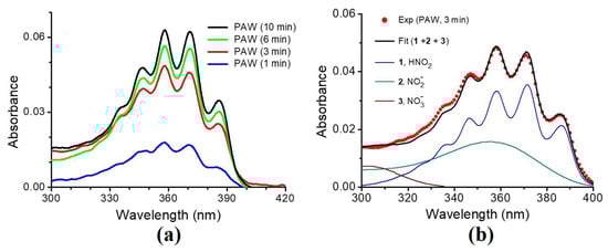 To further investigate the plasma-induced reactive nitrogen species, the optical absorption spectra of the PAW were measured. As shown in Figure 2a,b, the nitrite and nitrate reference solutions exhibited absorption peaks at 209.2 and 200.8 nm, respectively. The PAW exhibited an absorption peak at 205.5 nm, indicating that both nitrite and nitrate ions coexist in the PAW. Figure 3 exhibits the absorption spectra of the PAW in the wavelength region of 300–420 nm. For all the plasma activation times of 1, 3, 6, and 10 min, the absorption spectra of the PAW in Figure 3a exhibit four absorption peaks at 346.8, 358.1, 371.0, and 386.0 nm, respectively, attributable to the electronic transition of aqueous and . Meanwhile, the nitrite reference solutions exhibit a single absorption peak at 347 nm, as shown in Figure 3b. This result indicates that the PAW contains as well as . On comparing the measured absorption spectrum of the PAW with the molar absorption coefficients of , and which are described in the literature [,,,], the concentrations of , and in the PAW were estimated to be 0.59 , 0.72 , and 1.04 , respectively. When was approximated as the sum of , and , the concentration of measured by optical absorption spectra of the PAW in 300–420 nm was 2.3 . This concentration is comparable to that measured by a Nitric Oxide Assay Kit (DIOX-100). Under acidic conditions, the formation of conjugate acids (, , and ) corresponding to , , and could play an important role in the inactivation of fungal spores. These results demonstrate that the PAW produced by our soft plasma jet device contains RONS that react readily with cellular components such as lipids, proteins, carbohydrates, and nucleic acids and may result in significant damage to cell structures, cumulating in a condition known as oxidative stress [,].