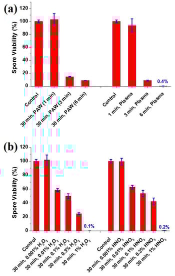 Viability of the A. brasiliensis spores treated by (a) the PAW and direct plasma and (b) chemically induced reactive oxygen and nitrogen species (RONS) ( and ) solutions. In (a), PAW (1 min), PAW (3 min), and PAW (6 min) are water activated by the plasma for 1, 3, and 6 min, respectively. Direct plasma treatment times are 1, 3, and 6 min. The contact time of the A. brasiliensis spores with PAW and chemically induced RONS solutions was 30 min.
