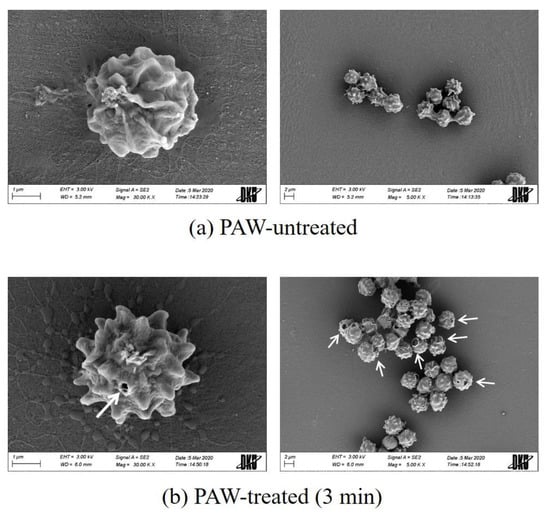 Typical SEM images of (a) PAW-untreated and (b) PAW-treated A. brasiliensis spores. The spores were treated by the PAW for 30 min. Arrows in the SEM image of (b) indicate the holes formed on the surface of the fungal spore cell walls.
