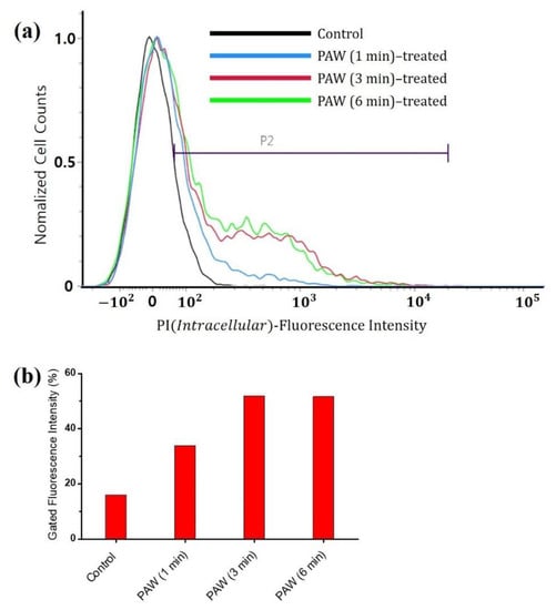 To verify and measure the level of structural damage in the cell wall and membranes of A. brasiliensis spores, we stained the PAW-untreated and PAW-treated spores with PI dye. The permeability of PI dye molecules through the damaged membranes in dead cells is relatively higher than that through a normal membrane in living cells. As shown in Figure 7, the gated fluorescence intensity of PI-stained A. brasiliensis spores is more intense in the PAW-treated spores than in the PAW-untreated spores. Subpeaks are clearly shown in the PAW-treated samples at higher fluorescence intensity, which were absent in the control sample. In Figure 7b, we present the P2-gated fluorescence intensity, calculated from the flow cytometry spectra of Figure 7a. It indicates a 3-fold increase in the PAW-treated samples compared to that of the control. Enhanced fluorescence in the PAW-treated spores is attributed to the penetration of the PI dye into the intracellular region of spores through the damaged membrane. The gated fluorescence intensity was similar between PAW-3 and PAW-6 treated spores. This indicates that the PAW with a plasma activation time of 3 min or more has the potential to cause sufficient damage in the fungal spores. Thus, these data support the results shown in Figure 6 and indicate that PAW can disrupt the rigid cell wall structure of melanized A. brasiliensis spores. The Aspergillus cell wall is a complex structure composed of a network of polysaccharides (-glucan, -glucan, chitin, and galactomannan) and cell wall proteins. Thus, we recognize that the Aspergillus cell wall is an essential factor in maintaining the shape and integrity of the fungal cell []. Our study revealed that PAW induced the loss of cell wall integrity and its protective function in the spores. Because cell membranes control traffic into and out of cellular components, damaged membranes lose their control function and thus allow intracellular components such as nucleic acids, proteins, and other metabolites possibly to leak out. However, we do not know yet what cell wall components were affected by RONS in the PAW. According to the proteomic study by Guozheng et al., cellular membrane damage was not the main reason for -induced death of Penicillium expansum, a food spoilage fungus []. Their results suggest that mitochondrial impairment due to the functional alteration of oxidative stress-sensitive proteins is associated with fungal death caused by . Since we detected and in PAW-3 and PAW-6, we deduced that and in the PAW passed through the opened pores in the cell wall to enter the spore cells and to react with oxidative stress-sensitive intracellular components (DNA, proteins in mitochondria) and eventually bring about spore cell death. This deduction would describe one of the mechanistic processes that lead to the inactivation of fungal spores.