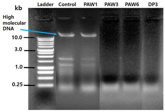 Electrophoretic analysis of genomic DNA from A. brasiliensis spores treated by the PAW. Lane 1 (ladder): 1 kb ladder DNA marker, lane 2 (Control): negative control of genomic DNA from the A. brasiliensis spores without the PAW treatment, lane 3 (PAW1): genomic DNA from the A. brasiliensis spores with PAW-1 treatment, lane 4 (PAW3): genomic DNA from the A. brasiliensis spores with PAW-3 treatment, lane 5 (PAW6): genomic DNA from the A. brasiliensis spores with PAW-6 treatment, and lane 7 (DP3): positive control of genomic DNA from the A. brasiliensis spores with direct plasma treatment for 3 min.