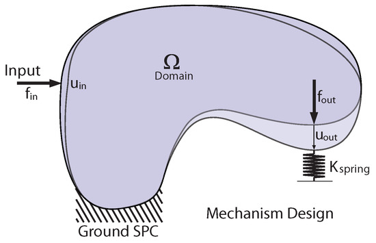 The synthesis of compliant mechanisms is the design of a particular type of structure that can convert a displacement or a force from an input point (actuator) to an output point to a different direction, using the deformation work efficiently. It is a mechanical component design problem that is usually solved as a single-objective optimization problem. The objective represents a kinematic requirement, such as the maximization of the motion or the force amplification. However, this kind of problem should be better posed as a minimum two-objective optimization problem. On the one hand, a compliant mechanism designed only to be flexible can meet kinematic requirements through deformation, but it could be too flexible to bear external loads. On the other hand, a compliant mechanism designed only to bear external loads could meet structural requirements but could require too much force to achieve a desired motion, producing high stresses as a result. Therefore, the design must be decomposed into a kinematic (for motion) and structure (for load-carrying capabilities) design problem that are simultaneously considered. This task can be accomplished in different ways, by using different objective functions. Lu and Kota describe the most common objective functions for the design of Single-Input Single-Output (SISO)-compliant mechanisms and suggest how they can be combined in a single-objective optimization [28]. If the strain energy is to be minimized and the mutual energy is to be maximized, individual optimization problems can be formulated as described in Section 2.1 and Section 2.2, respectively.