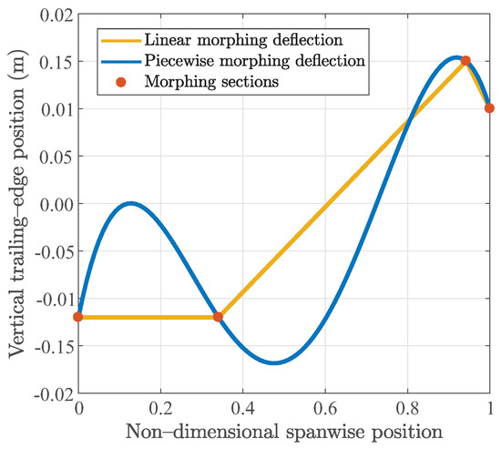 where is the nonlinear Class function that mathematically defines a variety of basic general shapes. and are the non-dimensional vertical trailing and leading edge position, respectively. The square matrix contains the Bernstein polynomial components of order m which define the unit spanwise shape function; the square matrix contains the Bernstein polynomial components of order n which define the unit chordwise shape function. The rectangular matrix contains the extra coefficients acting in a spanwise and chordwise direction, and allows to compute the two-dimensional shape function . Considering the matrix , each row defines a component airfoil, and the first and last rows contain the extra coefficients of the two airfoils placed at the tips of each wing sub-element. The first and last columns are related to the leading and trailing edge boundary conditions and can be used to define the spanwise deflection law. When the parameterization technique is used to introduce the morphing deformations, the matrix can be partitioned into three sub-matrices: the first and last portions are related to morphing the leading and trailing edge, respectively, while the middle one is related to the wing-box shape. In this case of morphing, the extra coefficients acting on the leading and trailing edge represent the optimization variables, while the other extra coefficients can be evaluated by a least-squares fitting that can meet the constraints related to the 3D wing-box volume. The mathematical formulation of this implicit constraint is similar to the parametric identification described in [34], but it is extended to the three-dimensional domain. Two different shapes of a morphing trailing edge installed on the GRA wing have been generated while considering a chordwise rear spar position equal to and two different vertical trailing edge position laws reported in Figure 5. The corresponding shapes are shown in Figure 6 where the wing representation was divided into three sub-elements, which were naturally defined by two kinks.