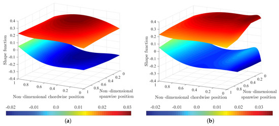 Non-dimensional shape functions of undeformed (a) and morphing (b) wing geometries: colors indicate the values of the function in the non-dimensional square domain.