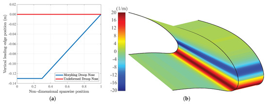 All of the details related to the aerodynamic solver, its integration with the optimization process and how the shape design was conducted can be found in [39]. The optimal morphing shape for both the landing and take-off conditions has been defined. Two-dimensional Bernstein polynomial shape functions for both undeformed and maximum droop nose deflection configurations are reported in Figure 8. The corresponding spanwise vertical leading edge position is reported Figure 9 together with the corresponding skin curvature variation that satisfies the structural constraints. The maximum droop deflection is constant in the inboard region, while it linearly decreases from to in the outboard region.