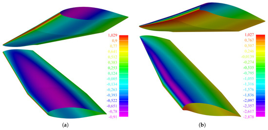 The set of critical load cases, used by the second level of optimization, are shown in Figure 11 in terms of the pressure distribution acting on the wing. The first load case refers to the wing shape without a morphing leading edge, with an angle of attack of = 18 deg and a dynamic pressure of = 2561 Pa, which correspond to the landing conditions at sea level. The second load case refers to the maximum droop nose deflection shape, with an angle of attack of = 0 deg and a dynamic pressure of = 5000 Pa, which correspond to the Placard speed at sea level.