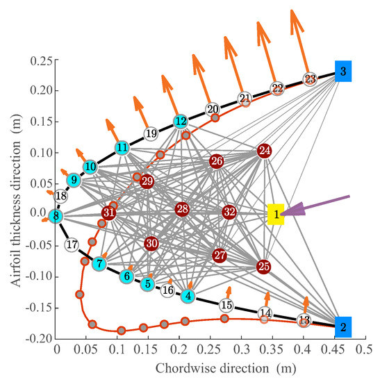 According to the optimization algorithm described in [34], the first term represents the implicit wing-box constraint. It acts on the three-dimensional wing-box region, which is delimited by the front and rear spar positions, and it is described by pairwise distinct coordinates coming from the CAD model of the undeformed wing. represents the reduced CST-Vandermonde matrix, where r is the number of perturbed coefficients, and is the corresponding vector. The unique solution of this linear system is equivalent to solving, in the least squares sense, the over-determined system that allows us to compute the extra coefficients of the matrix , reorganized in the vector . The pairwise distinct real points are given and placed along the wing-box region, which must be kept undeformed. The r extra coefficients for each row of the matrix are the optimization variables that affect only the domain outside the wing-box region. The second constraint represents the wing-box extension defined by the non-dimensional front spar position and rear spar positions . The inflatable term allows us to limit the internal area variation , with respect to the internal area of the undeformed wing shape , and it is introduced to avoid the generation of unrealistic morphing shapes. The main structural constraint for the skin is to keep its skin length constant to avoid axial stress. The last constraint is used to limit the maximum curvature variation computed between the undeformed shape and the morphing shape. This strategy allows us to control the maximum bending strain according to the material properties of the skin, as follows,