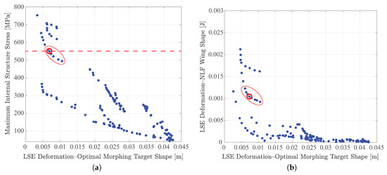 The approach used to solve the MOGA problem applied for our purposes is the so-called Elitist Non-Dominated Sorting Genetic Algorithm (NSGA-II) [24]. In NSGA-II, the offspring population is combined with the parent population, from which it is created, to form a population of size , where N is the initial population size. Instead of finding the non-dominated front only, the two populations are considered together, and a non-dominated sorting is used to rank the entire population. This approach requires more computational effort, but it allows a global non-dominated check among offspring and parent solutions. The diversity inside the population is introduced by using the crowding comparison procedure, which is used with the tournament selection and during the population reduction phase. As solutions compete with their crowding distances, no extra niching parameter is required. The NSGA-II can find a number of trade-off solutions between the different objectives in one single simulation run. The most important and useful aspect from the compliant structure point of view is that the obtained non-dominated front has distinct regions with different topology solutions. Within each region, the solutions vary by having different cross-sectional areas of load-paths, while keeping the same topology. Each region has a limit in the values of the objective functions. To improve a solution beyond these limits, a different topology, and thus a different region of the Pareto front, must be explored. During the design activities, knowledge of these trade-off solutions allows us to select the most suitable design point. The Pareto front represents all of the possible and feasible internal structure solutions that can produce all of the aerodynamic shapes that the device must be able to take during the mission, under all of the external loads selected from the flight envelope.