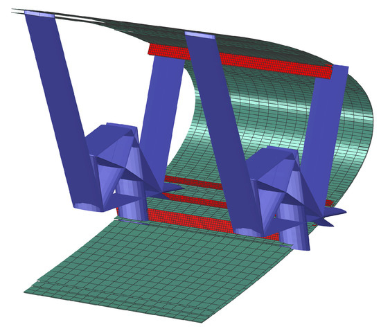 At the end of the previous step, the numerical design phase can be considered to be finished, as an optimized model has been obtained such that it well satisfies the requirements in terms of the shape quality of the deformation and, at the same time, it does not violate structural limitations. Last step, but not the least important, allows us to verify the structural performance of the complete active adaptive wing device, to simulate the three-dimensional and time-varying nonlinear elasticity and the structural dynamics. The starting point of the fourth level is the three-dimensional CST representation of the external wing shape and the set of optimal compliant structure solutions that are computed for different sections along the wing span. To generate the finite element model of the entire morphing device to be installed on the wing, an automatic interface between the CST technique and computer-aided engineering software, including Abaqus and CATIA, has been developed. This level enables the manual creation of manufacturing details, actuation kinematics, and connections between different parts of the structure, and it provides greater capabilities for modification. Moreover, it is possible to adjust the thickness of each compliant rib to meet the forces that are needed. Modeling of all of these details allows for a more realistic estimation of the stress distribution inside the structure and three-dimensional shape quality verification. The structural solution shown as an example in Figures S1 and S2 is used to generate the finite element model of a complete compliant trailing edge device. It can produce a spanwise twist deformation, as shown in Figure S3, exploiting the capability of the designed compliant structure to achieve both upward and downward deflections.