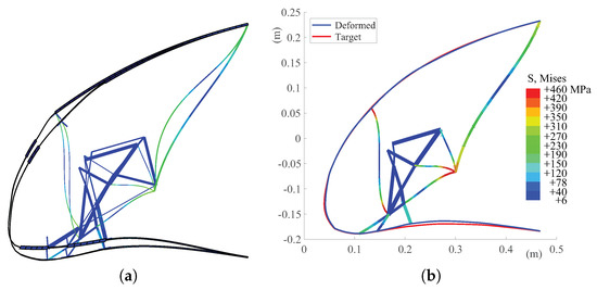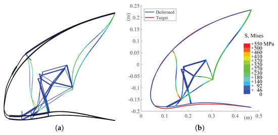 The Young’s modulus and the Poisson’s coefficient for the aluminum alloy are equal to the same values considered for the NiTiNOL in the elastic part of its constitutive curve. The admissible stress value considered during the optimization for the aluminum alloy is 550 MPa, according to the same unfeasible value accepted during the selection in the Pareto front. The admissible stress value for the NiTiNOL is 500 MPa, which is just below the stress level at the end of the loading plateau. During the optimization, the load path thickness is free to vary between 1 mm and 7 mm, while the skin thickness distribution is free to vary between 0.5 mm and 7 mm. The constrained non-linear optimization converges to an optimal solution in 52 iterations when the aluminum alloy is considered. The value of the optimal solution is 2.23 mm, and the maximum stress value found in the ribs is equal to 549.9 MPa, which satisfies the stress constraint. The comparison between the initial deformed shape and the optimal deformed shape is shown in Figure 16, where the stress distribution and the comparison between the deformed and target shapes are also illustrated.