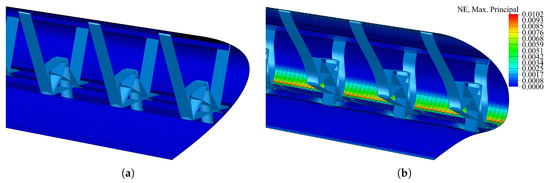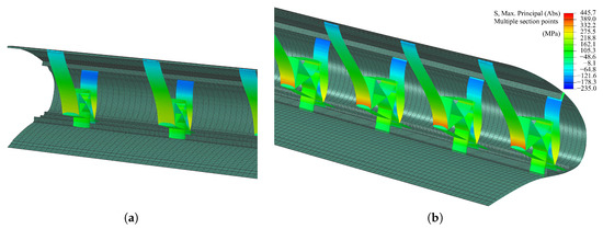 Stress distribution inside the compliant ribs at the wing tip (a) and wing root (b).