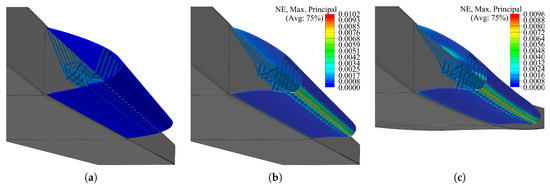 The undeformed and maximum droop nose configuration are also given in Figure 21, which provides the strain distribution in the outermost layer of the skin. The strains show a very constant distribution in the spanwise direction, and the maximum strain value perfectly matches the skin structural constraints imposed in the first level of optimization. These results represent an important verification that confirms how the structural constraints used during the aerodynamic shape optimization allow us to simplify the design of the compliant structures without limiting their generality.