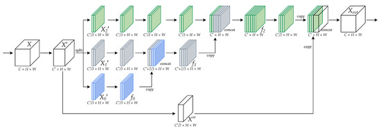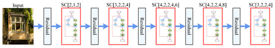 Here, the subscripts of represent multiple transformation operations, ⨁ indicates the feature concatenation. Consequently, the output feature maps of a SC block can be expressed as follows: