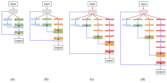 SC blocks with different configurations. (a) SC-(2,1,2); (b) SC-(3,2,2,4); (c) SC-(4,2,2,4,6); (d) SC-(4,2,2,4,8).