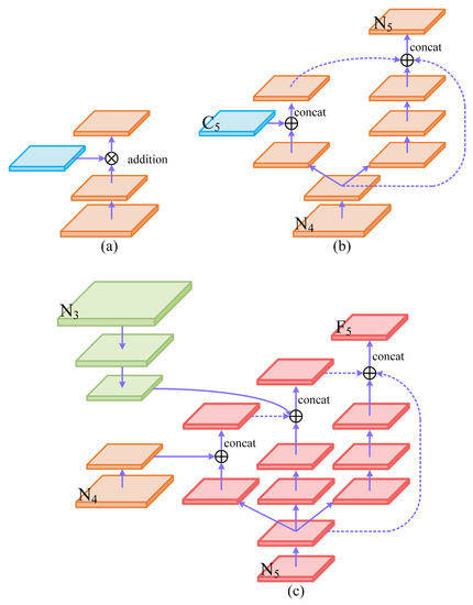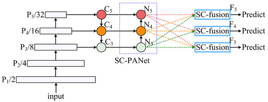 We exploit the SC block to realize the multi-scale feature fusion, and propose a feature pyramid network SC-FPN; the diagram is illustrated in Figure 4. First, we choose feature maps at level 3 to 5 from the backbone to formulate the typical top-down FPN. indicate the newly generated feature maps. Then, an additional bottom-up pathway is connected behind the FPN to further boost the flow of information. We use the SC block to remodel and enlarge the PANet [34], as can be seen in Figure 5b. Feature maps are obtained. These feature maps with different spatial resolutions are then fused. A common solution is to adjust the dimension and then merge them together by element-wise sum or concatenation. Recent works point out the defect of integrating different resolution feature maps at the same proportion [35]. These feature maps of different resolutions contribute unequally to the detection of objects of varying sizes. To alleviate this issue, we exploit the SC block to merge multi-scale feature maps. As shown in Figure 5c, the feature maps are fed to an SC-fusion block to generate newly feature maps . In general, the low-resolution feature maps are more important to detect large objects. Therefore, we assign different levels of attention to these feature maps based on their spatial resolution, occupies first place, comes second and is the last. The SC-fusion block takes the as input, and merges the semantic information of and one by one. Sampling depth reflects the level of attention. We employ max pooling layers and the nearest neighbor method to eliminate dimension conflicts in the feature fusion process. denote the feature maps generated by SC-fusion blocks that are intended for final prediction.