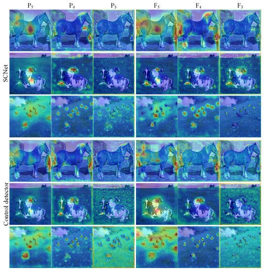In order to further explore the facilitating role of our SC block in feature fusion, we compare the heat maps of multiple feature maps at different depth. Figure 8 demonstrates the qualitative results of feature maps . Map the values calculated by channel-wise summation to input images to obtain the heat maps of feature maps. The color scheme we adopted is the warm-to-cool color scheme, where the warm colors represent areas of more interest to the network and the cool colors represent areas of less interest to the network. On a whole, the overriding concern of the network is the central area of the object. As shown in the first row of Figure 8, the horse attracts great attention from the feature maps due to the large size. On the contrary, feature maps and take no notice of the object and view them as the background. This indicates that the feature information in the corresponding area on the feature map and is filtered out and do not get involved in gradient propagation during training. However, it does not imply that these feature maps take no effect on the prediction of the horse; they facilitate precise localization. After SC-FPN, the network is more attentive to the central area of the horse as shown in , which is conducive to improve detection performance. The analogous circumstance can be observed in the heat maps of the second row. The feature maps and are responsible for detecting the two cows due to the different sizes. After feature fusion by SC-FPN, the feature maps and pay more attention to central areas which contain stronger semantic information; on the contrary, feature maps focus on the areas around the object which contain more geometric information.